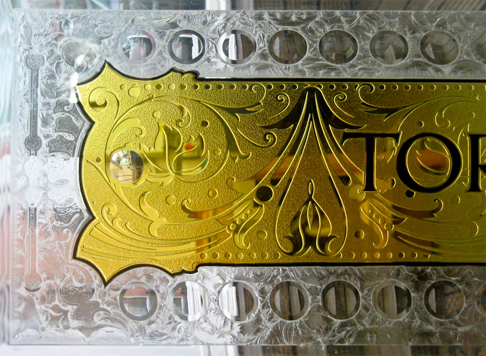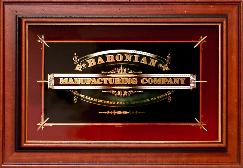 This small gilded glass sign was made for The Baronian Manufacturing Company in California USA in 2006. It employs matt finished gold and shading, mirror gilded-gold leaf, acid embossing and finger blending it also has small details of cut glass.