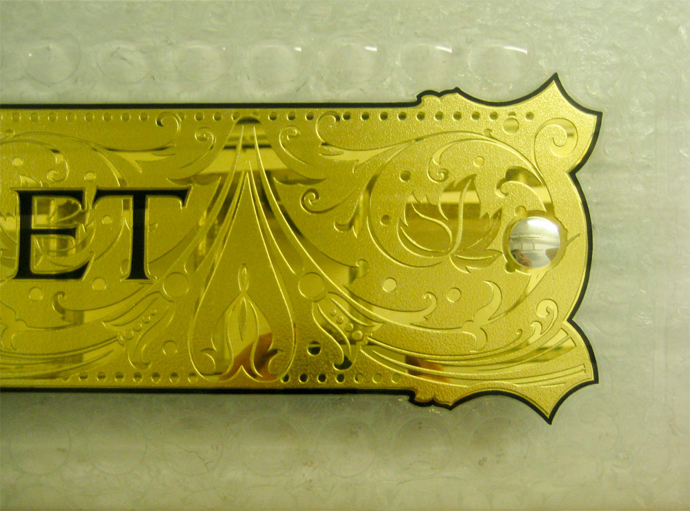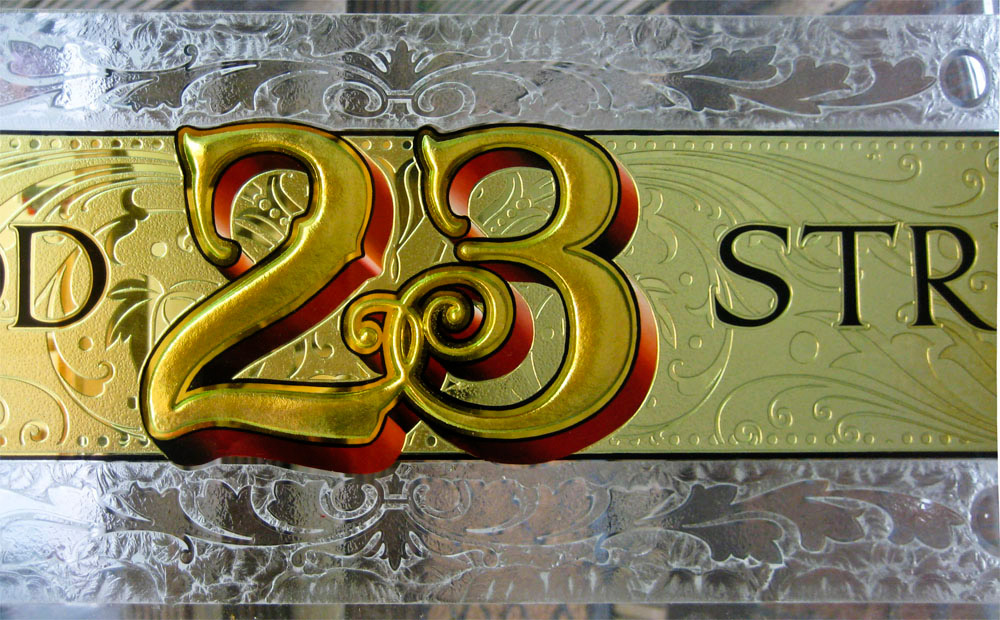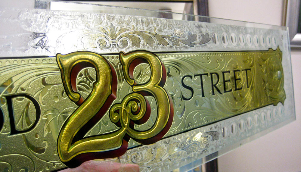 The techniques used to make this sign were acid mica stippled letters and the scrolled leaves were embossed, 23crt Gold Leaf and 12crt leaf was used for the letters and scrolls with blended shades. The wording Gold Leaf Artist has a blended effect of gold to silver.