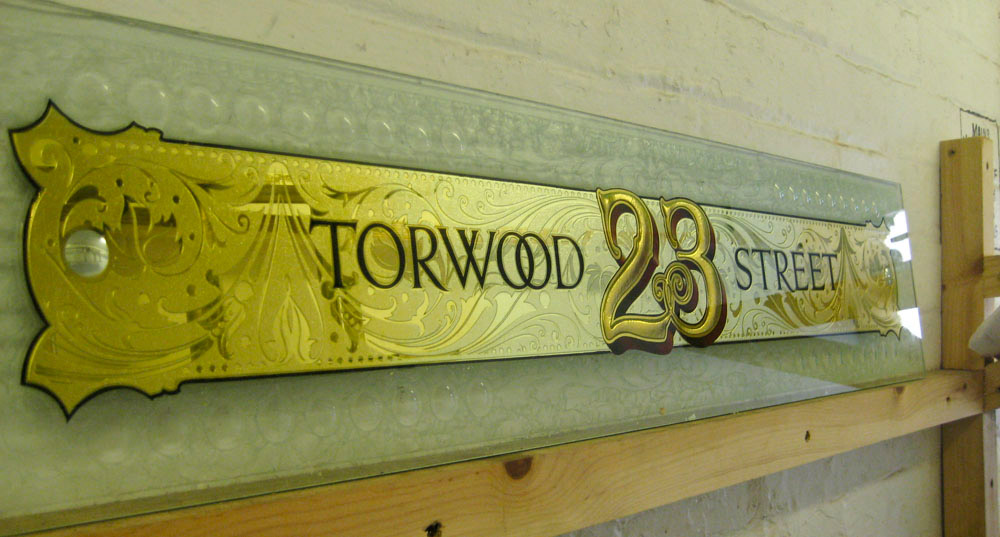 This glass sign was made as a birthday present for Gerald from his wife Sue. Gerald is also a traditional signwriter, but his main love and hobby is traction engines. He owns and operates a beautiful original traction engine called the Mistress.