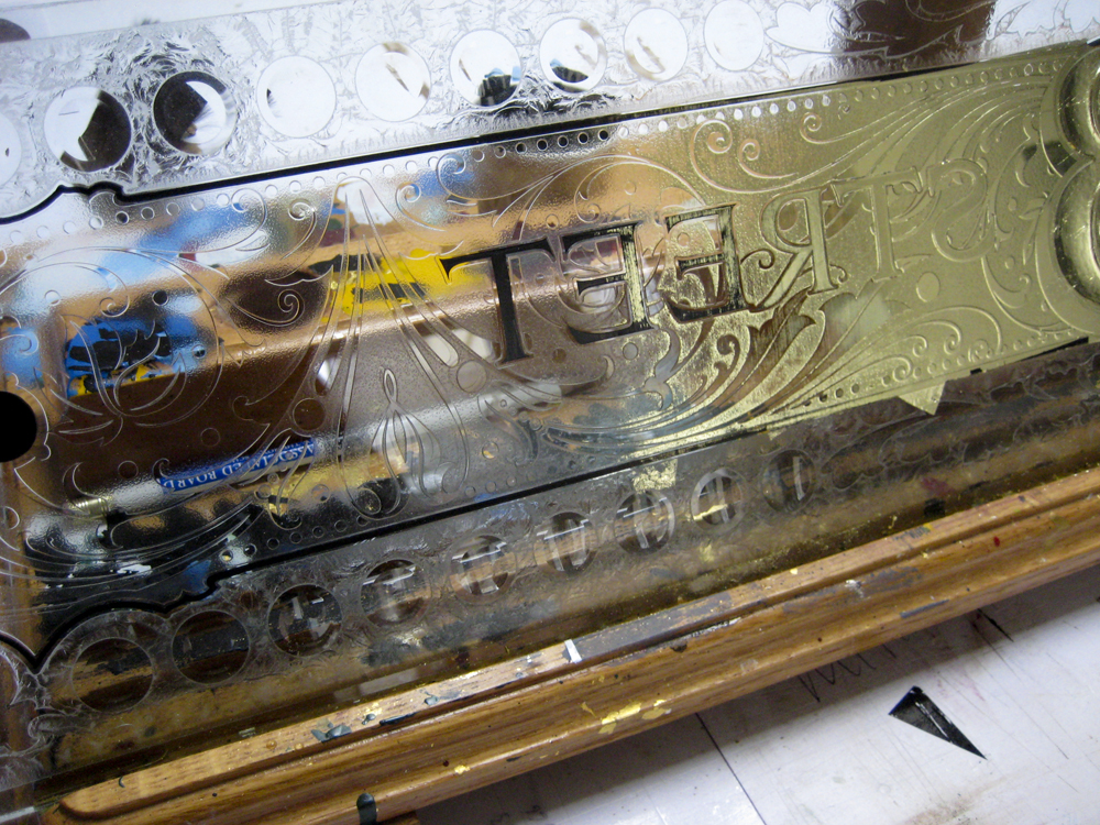 The background was glazed in Dragons blood red enamel which originally was purchased from Rick Glawsons Fine Gold Sign co. The red was laid down and when dry the background was blended from red to black giving the colour a deep maroon finish from the front. Some great colours and effects can be made using these glazes.