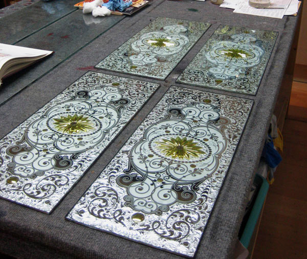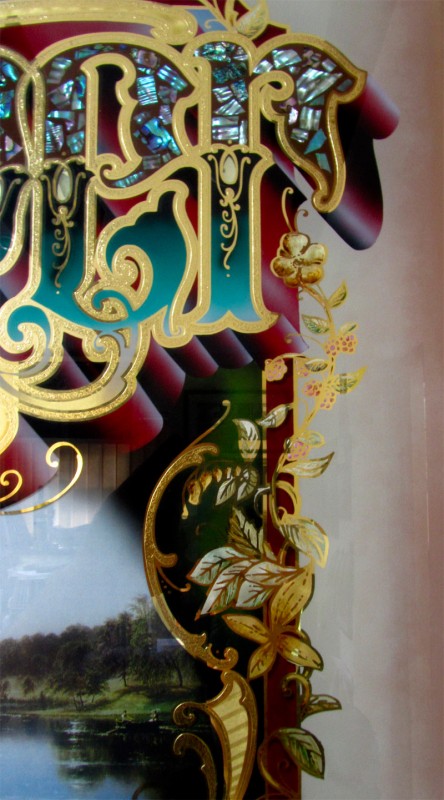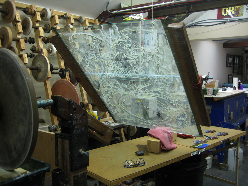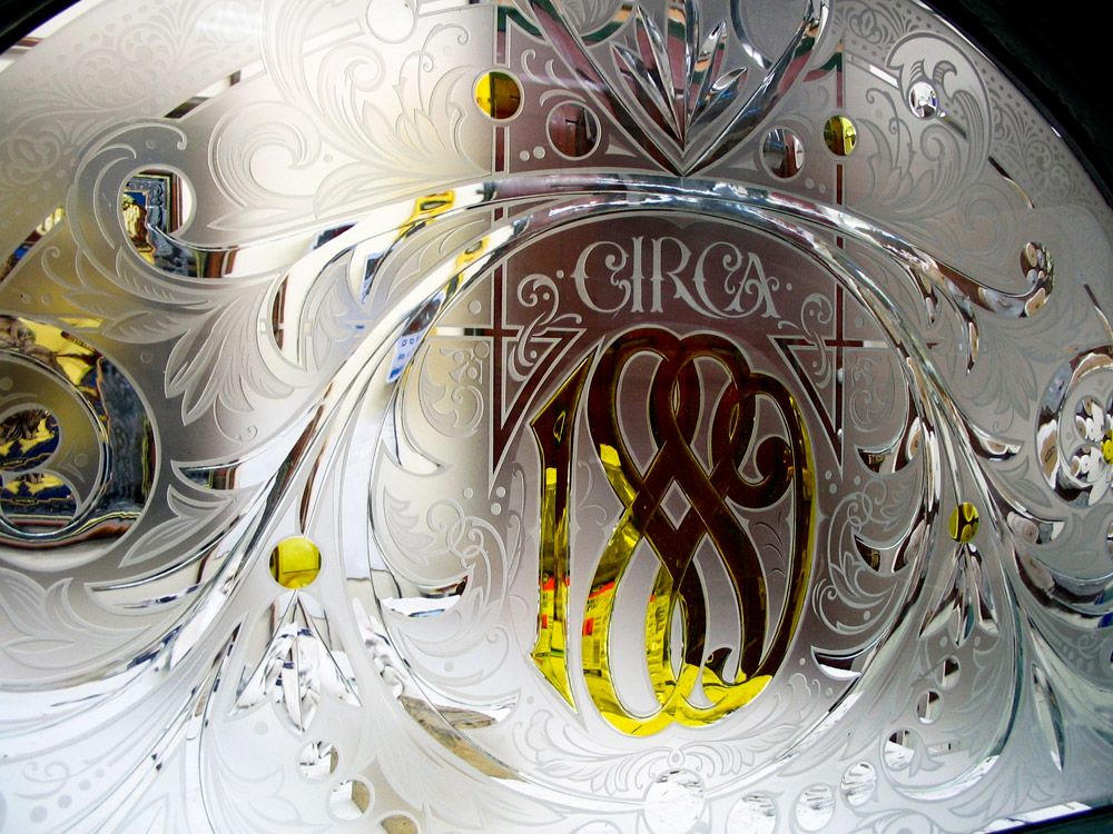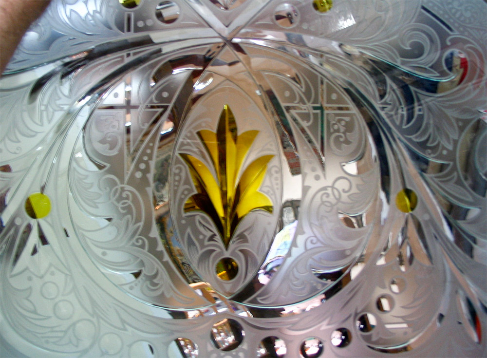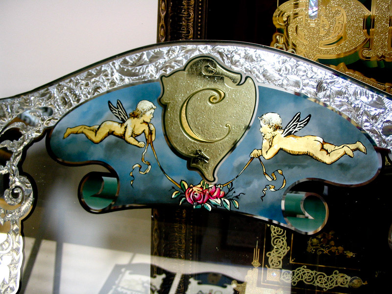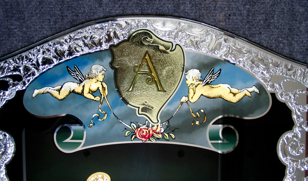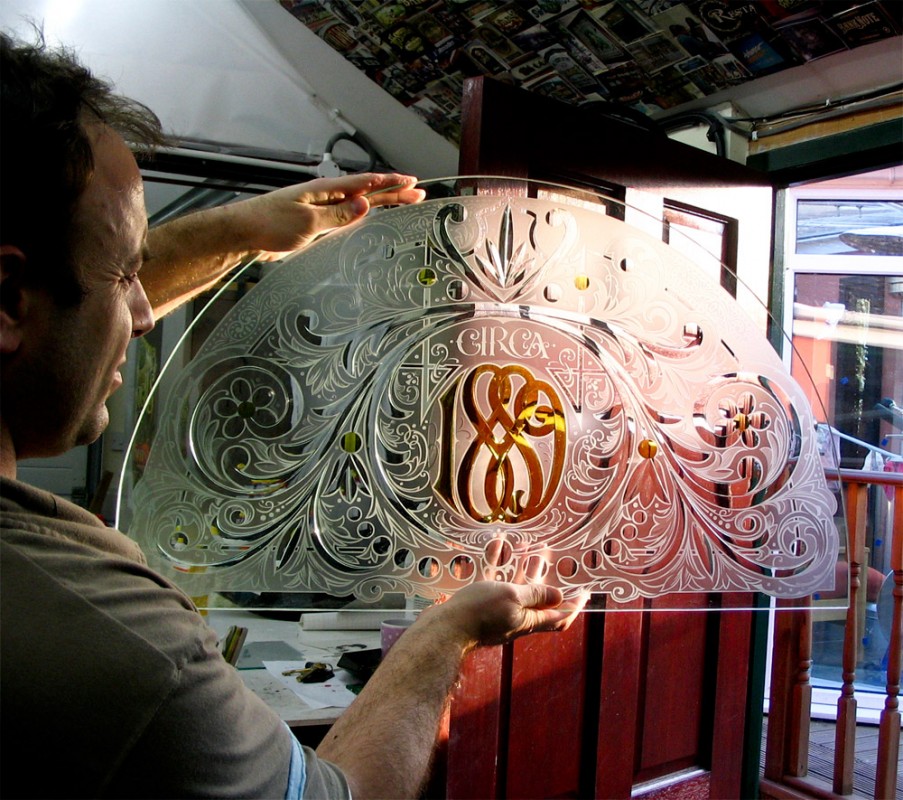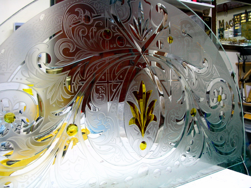 They had there own design and I built it into a circle of glass. The outer ring with scrolls is acid etched, the feet are deep sandblasted and water gilded with 18crt gold. Mother of pearl is round the inside border and the silver line is 12crt gold and glue chipped. The background is hand sign written and finger blended.