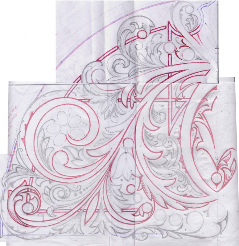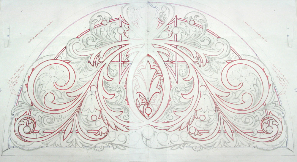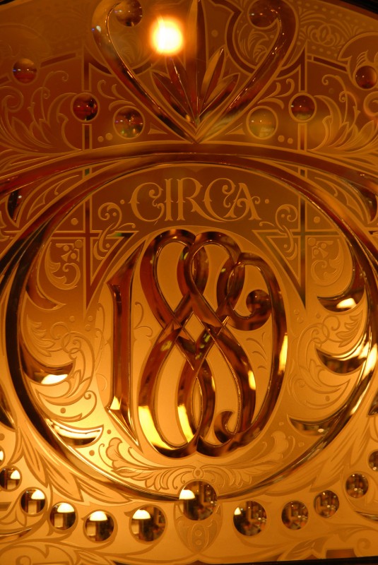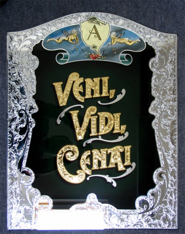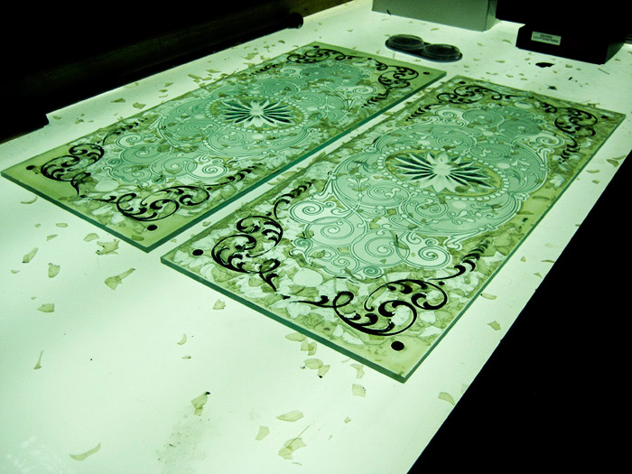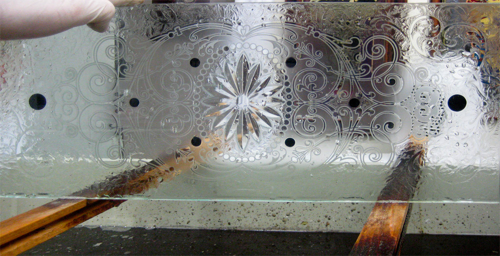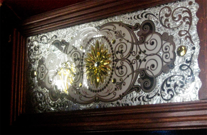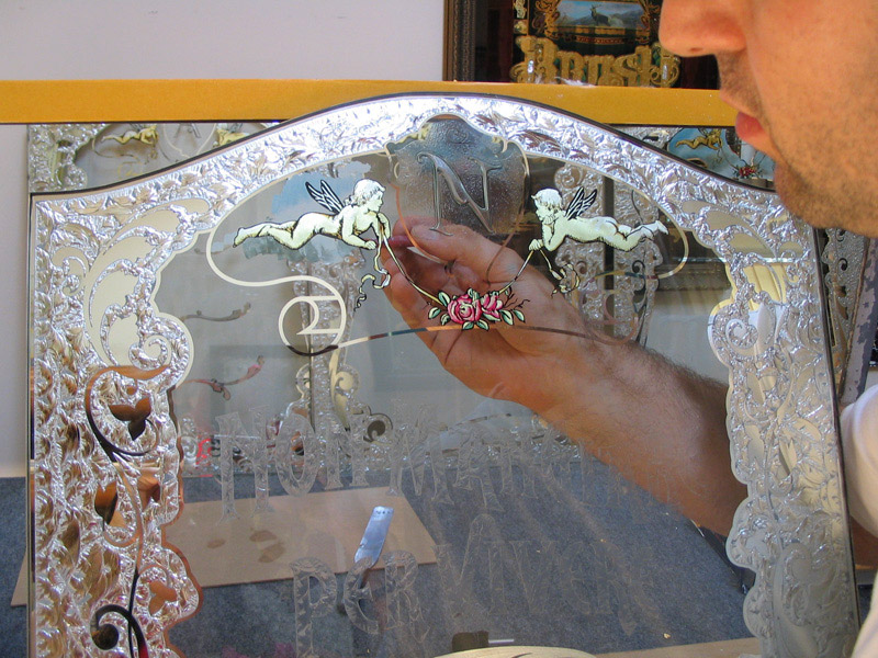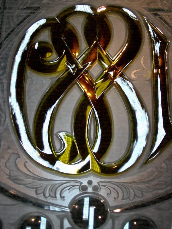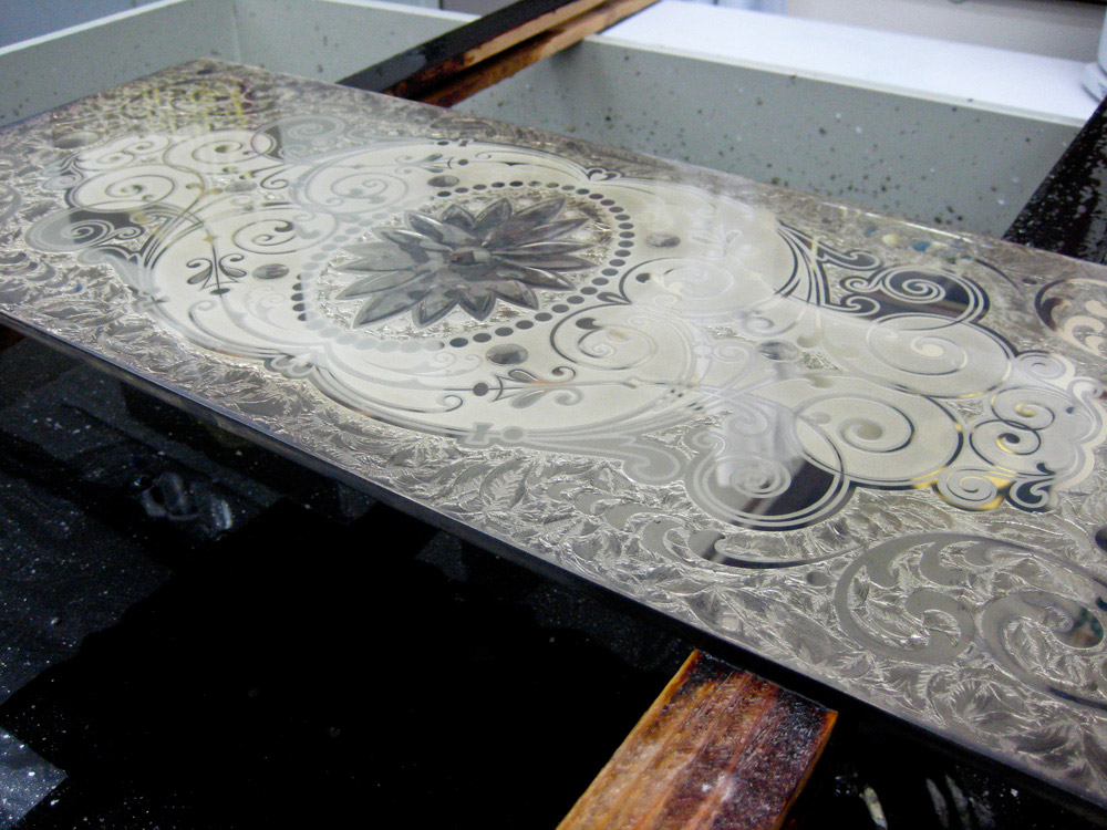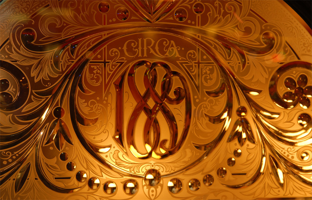 They had there own design and I built it into a circle of glass. The outer ring with scrolls is acid etched, the feet are deep sandblasted and water gilded with 18crt gold. Mother of pearl is round the inside border and the silver line is 12crt gold and glue chipped. The background is hand sign written and finger blended.