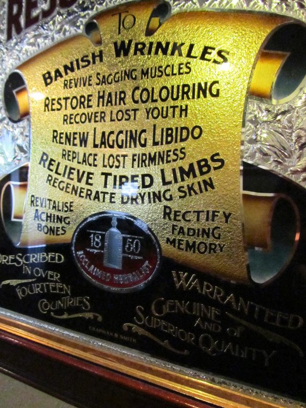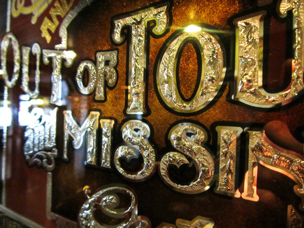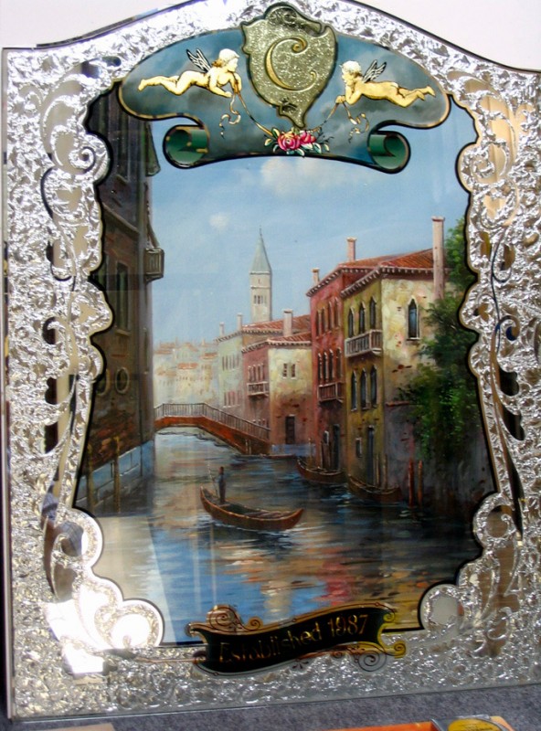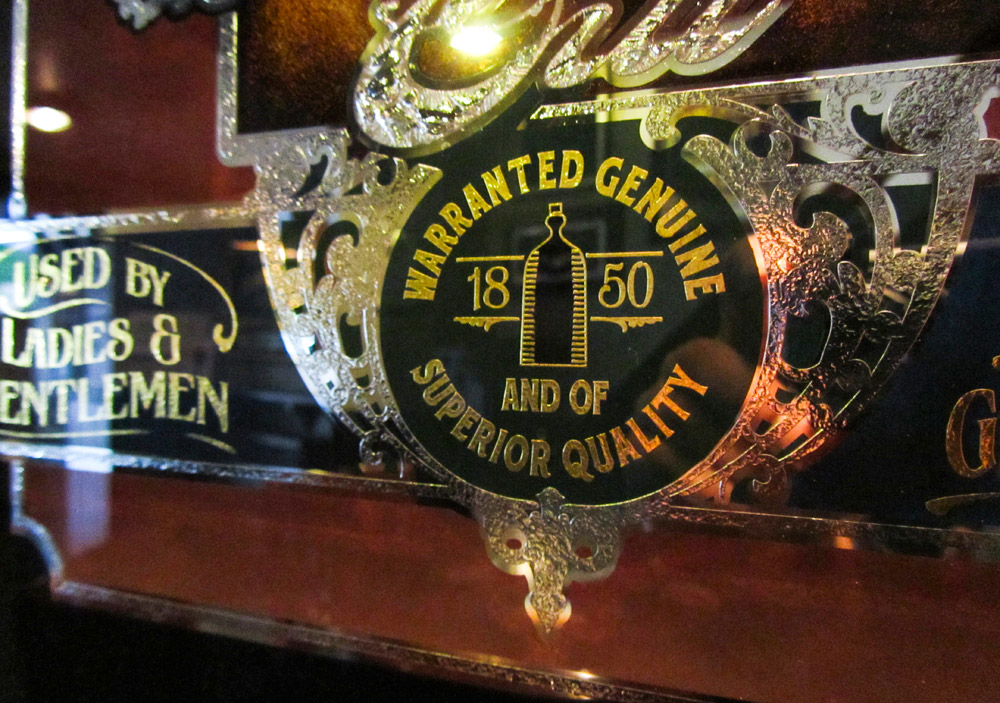The panel is glue chipped and silvered, the centre artwork is hand-painted, the main copy is acid mica etched and the name Mistress is deep blasted and gilded. Some of the scroll work is brilliant-cut and water gilded. Shaded letters are hand blended with enamels and various shades of gold-leaf were used for the lettering and flourishes. The glass sign is 39"s x 27"s and is quarter inch plate glass.