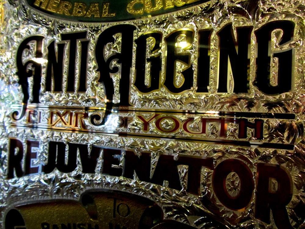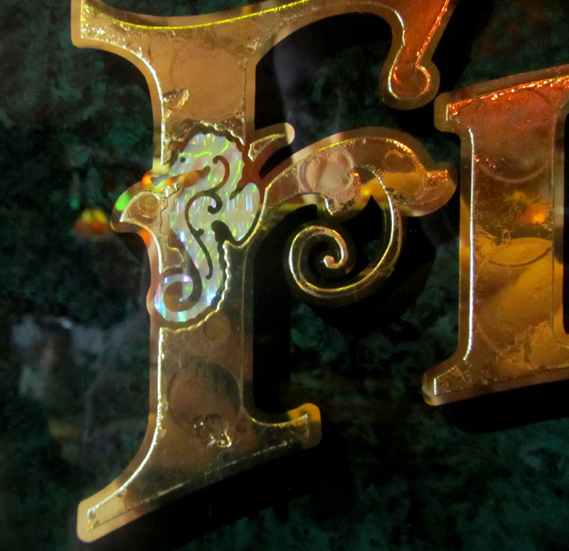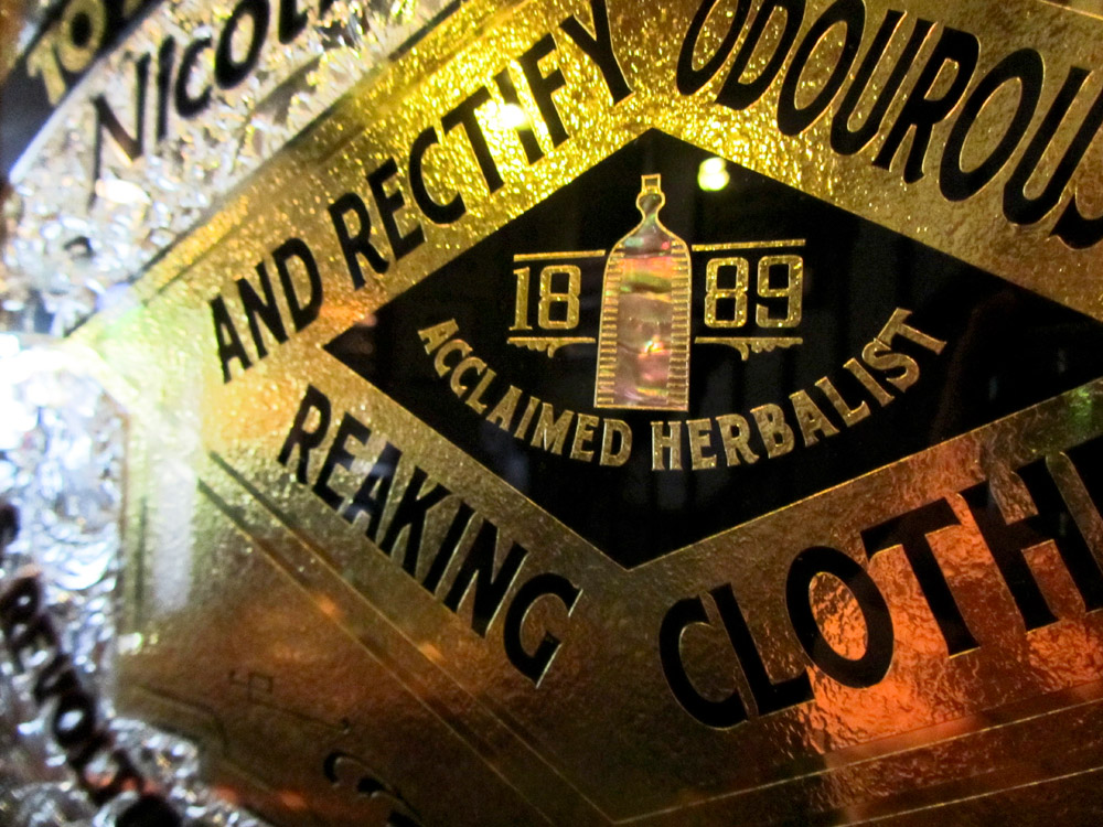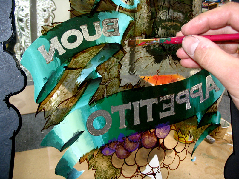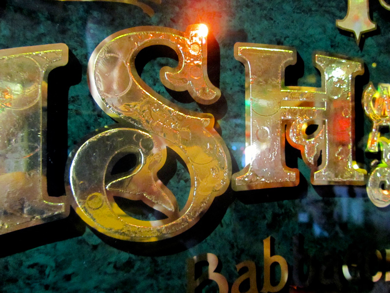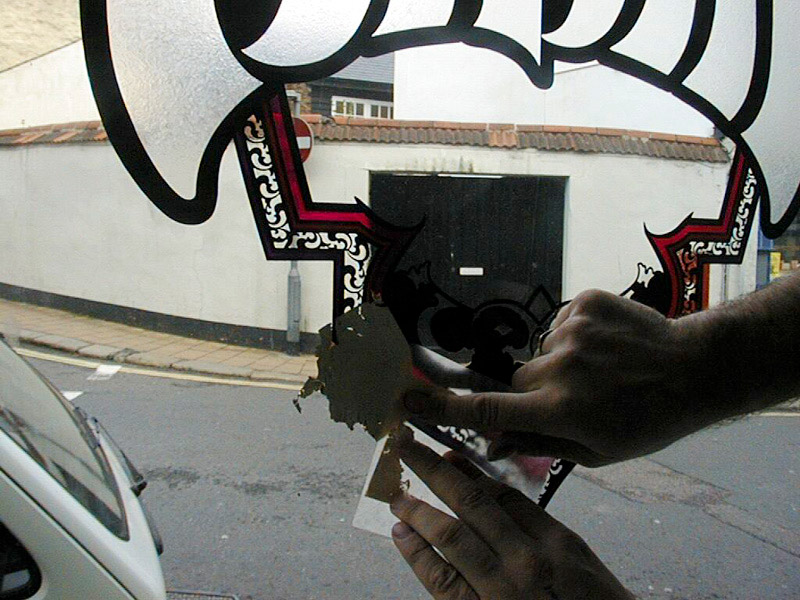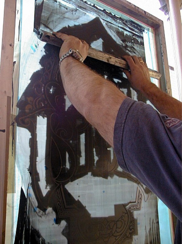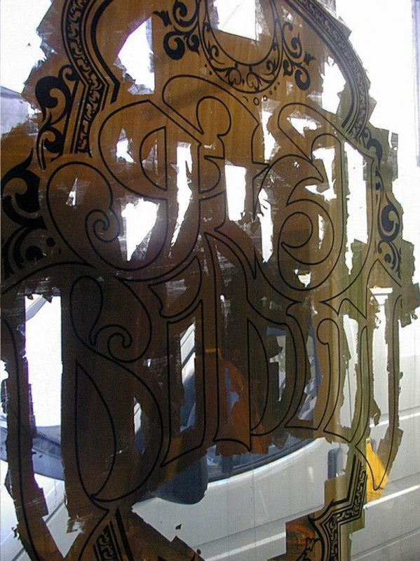 The letters were sponge stippled with emulsion paint, then submerged upside down in a bath of acid for 30 minutes. The emulsion broke down after 10 minutes, exposing other areas to acid causing irregular etching to the letters. Other acid treatments were made using mica and cross hatching techniques within the illustration. Mother of pearl, shading and finger blending was also used. The sign was made in 2004.