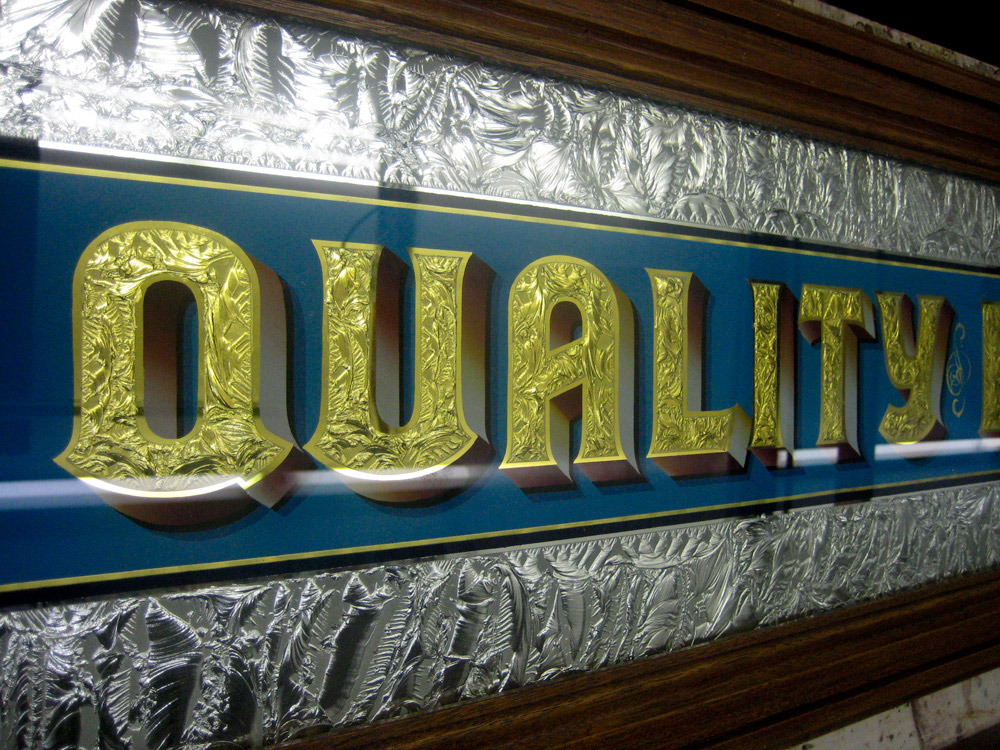 This glass sign is 4ft wide by 22". The letters are glue chipped and Angel gilded with various shades of goldleaf. Mother of pearl is used in the border details along with shading and blending, translucent coloured dammar varnish is also present in this glass sign. Made in 1993.