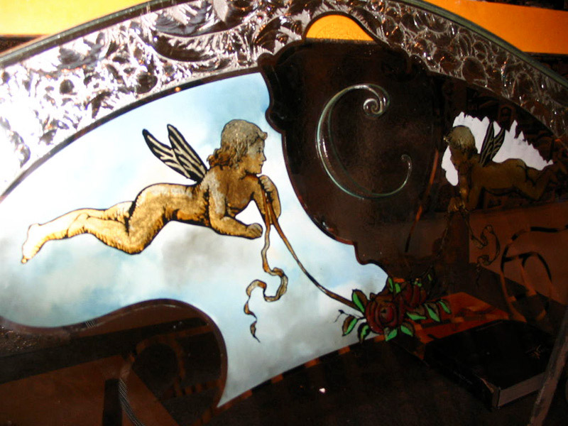 This is one of four decorative cut glass beveled mirrors. These mirrors were made in 2008 for ornate fairground gypsy caravans.