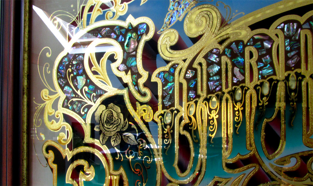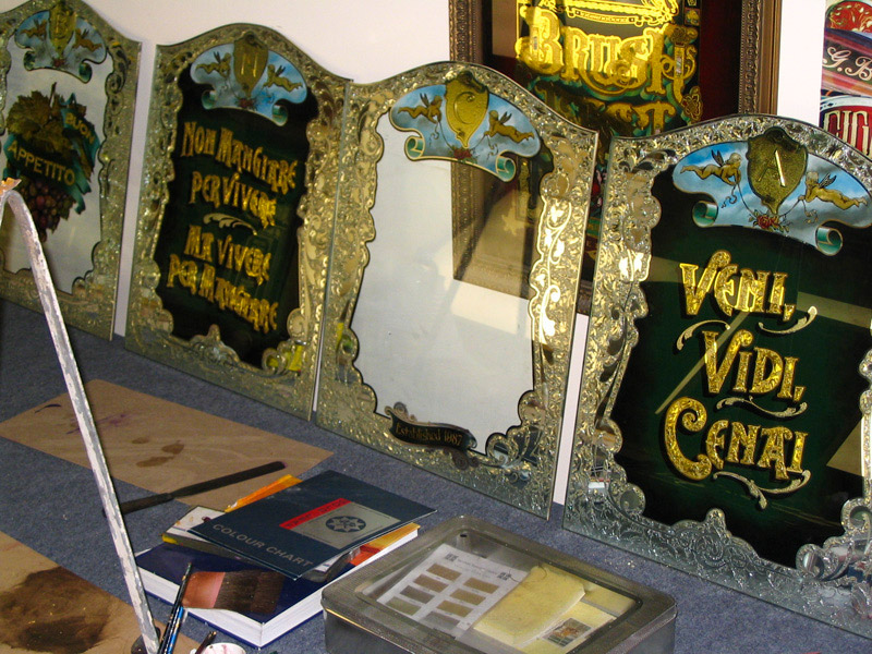 Noel and his family became good friends of mine and along with many talented signwriters in the states, he really helped me see what was possible in this art form and so at the meet in Denver, I enrolled in Noel's glass workshop for 4 days of gilding and painting.