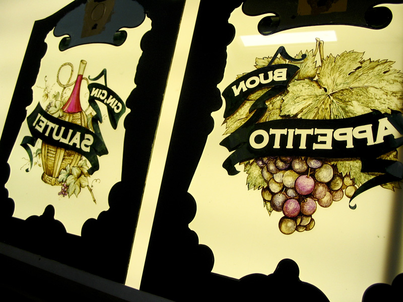 5 glass panels commissioned by Biancos Restaurant Torquay in 2004. Heavily glue-chipped, silvered, gilded and hand-painted on the reverse side of the glass.