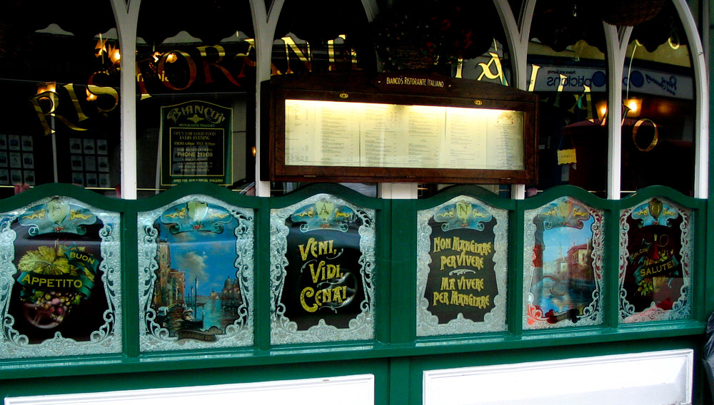 These hand-painted pictorials face out into the street, surrounded by the bespoke, wooden frames as seen in picture three.