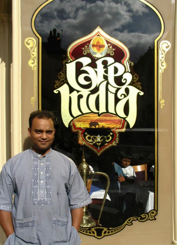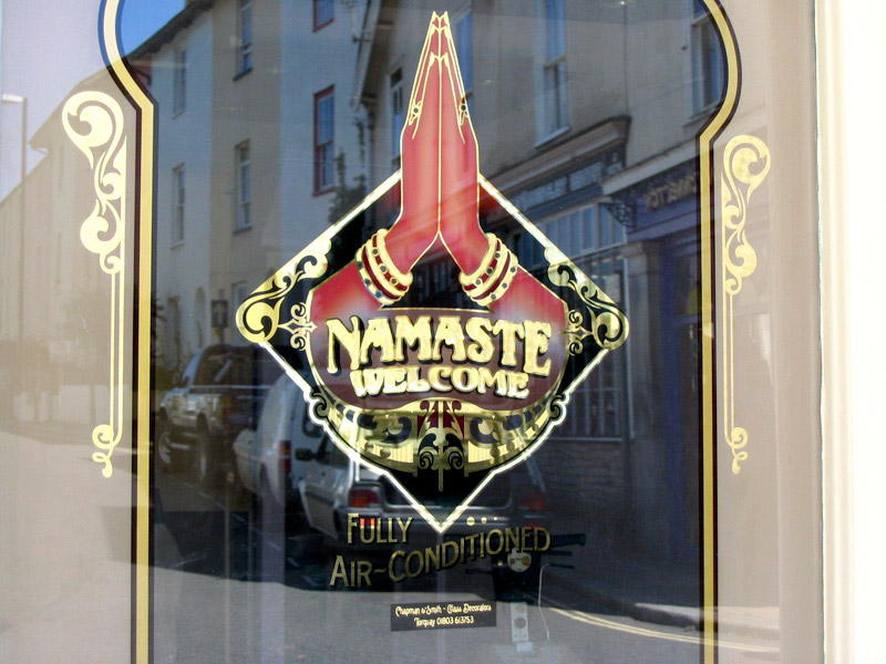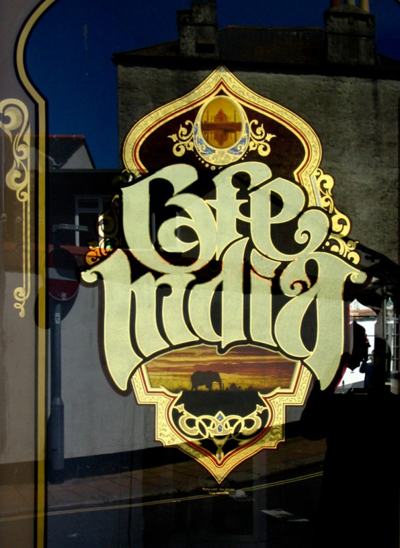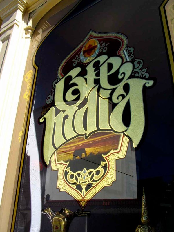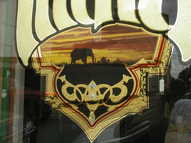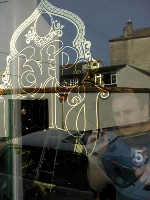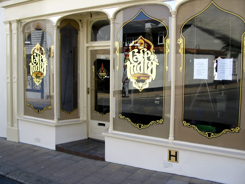 I designed and made these glass panels in 2005. They consist of hand painted and screen printed work with mother-of-pearl inlay and various shades of gold leaf. This reverse glass work can still be seen on the windows of Café India, Totnes.