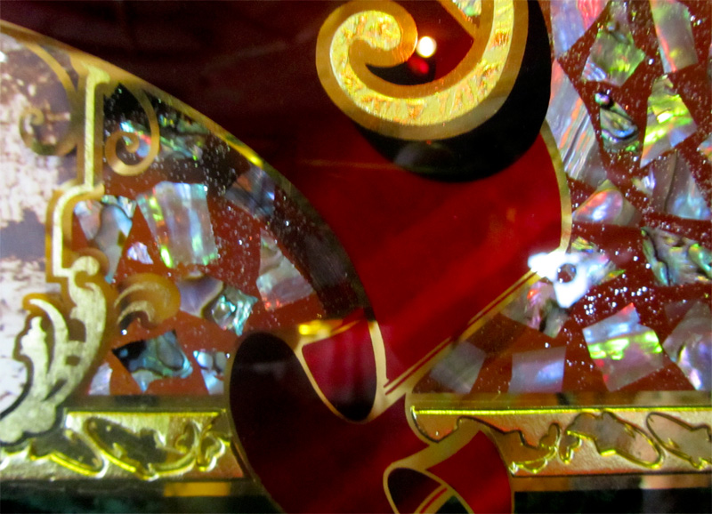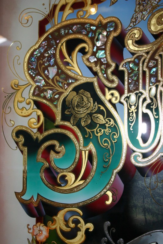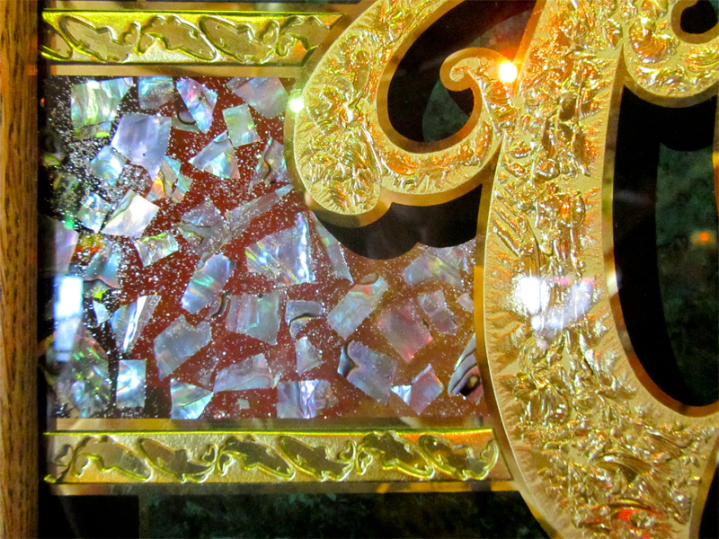 Mother of pearl and abalone shell is used around the circle design. The girl pictorial is hand painted in reverse. Backgrounds are finger blended along with cast shadows painted and blended around the letters by hand. This was a fun project to make and I had good company to work with.
