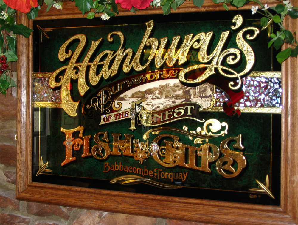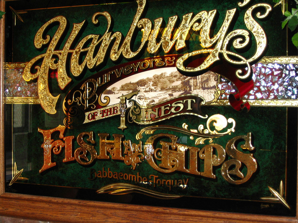 This glass sign was commissioned by Dave Hanbury for his award-winning fish and chip emporium in Torbay, 2004. The size is 3ft by 29"s