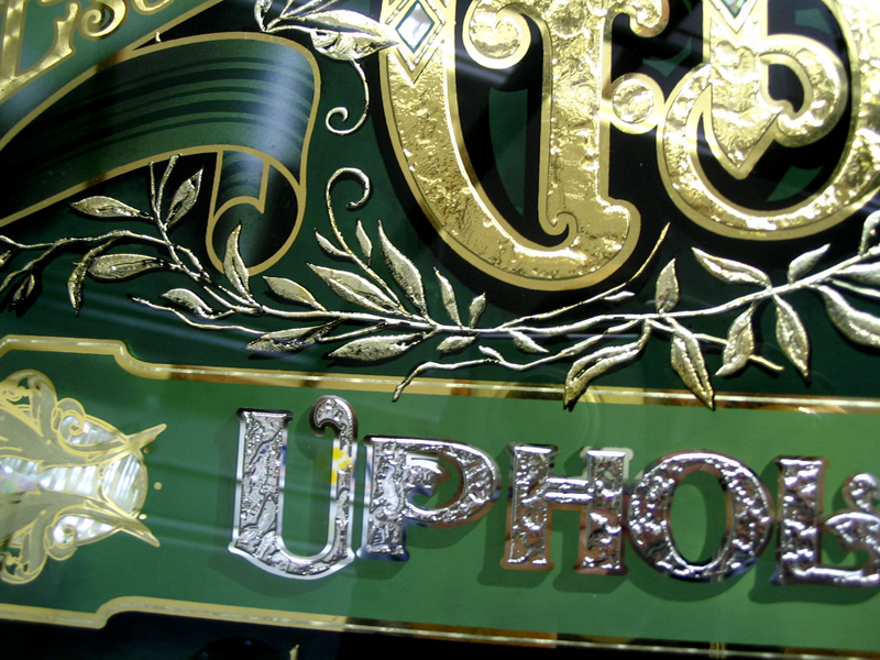 He specialises in bespoke upholstery and motorbike seat covers. He asked me to design and make him a glass sign advertising his business. This glass sign is 28"x 18" and entails the use of 24crt, 22crt, 16crt and 12crt gold leaf.